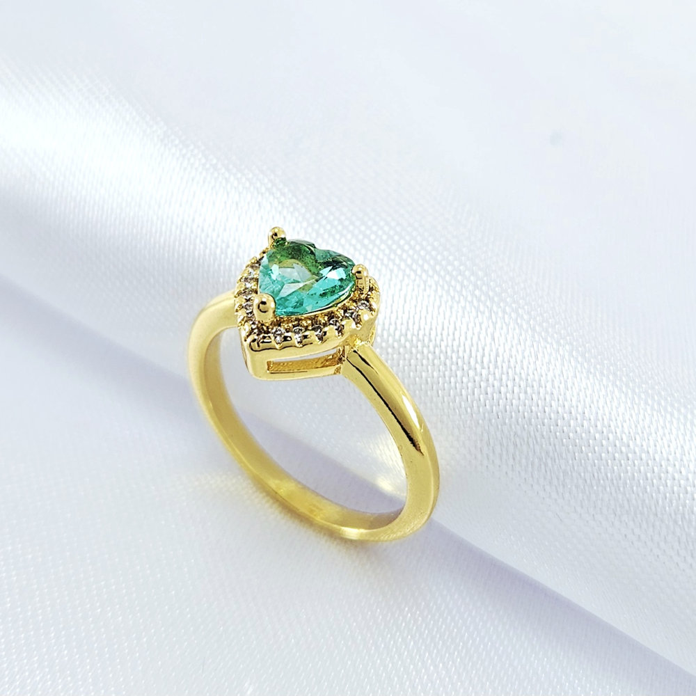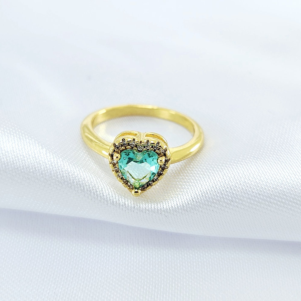 Anel coração com pedra verde claro borda cravejda