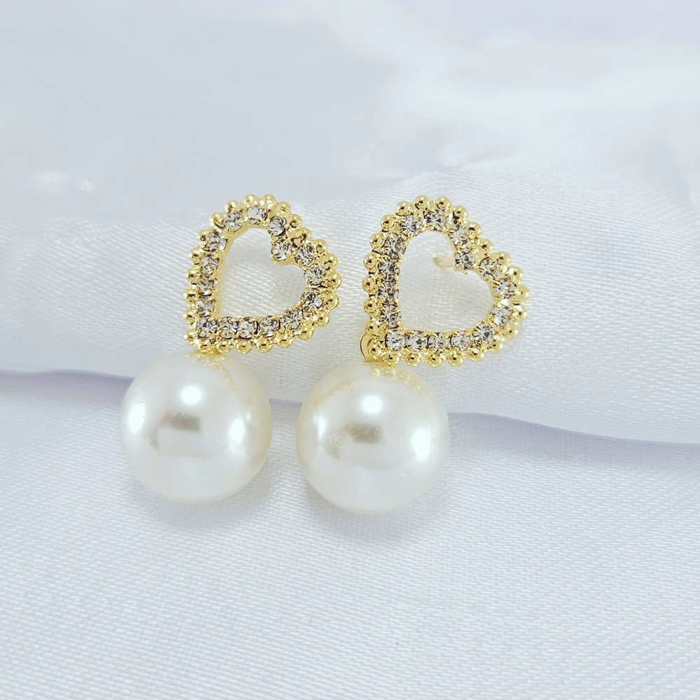 Brinco coração cravejado vazado com pêndulo pérola
