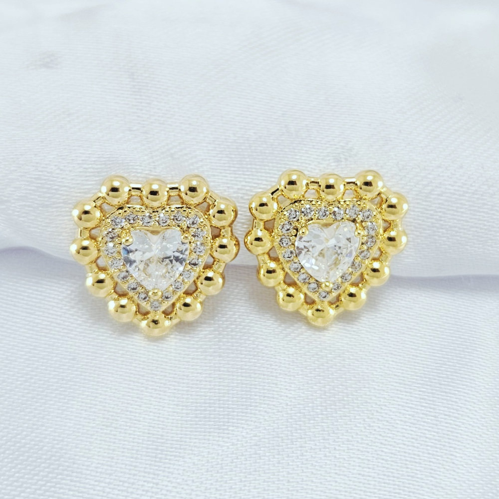 Brinco coração pedra cristal com detalhe bolinhas dourado