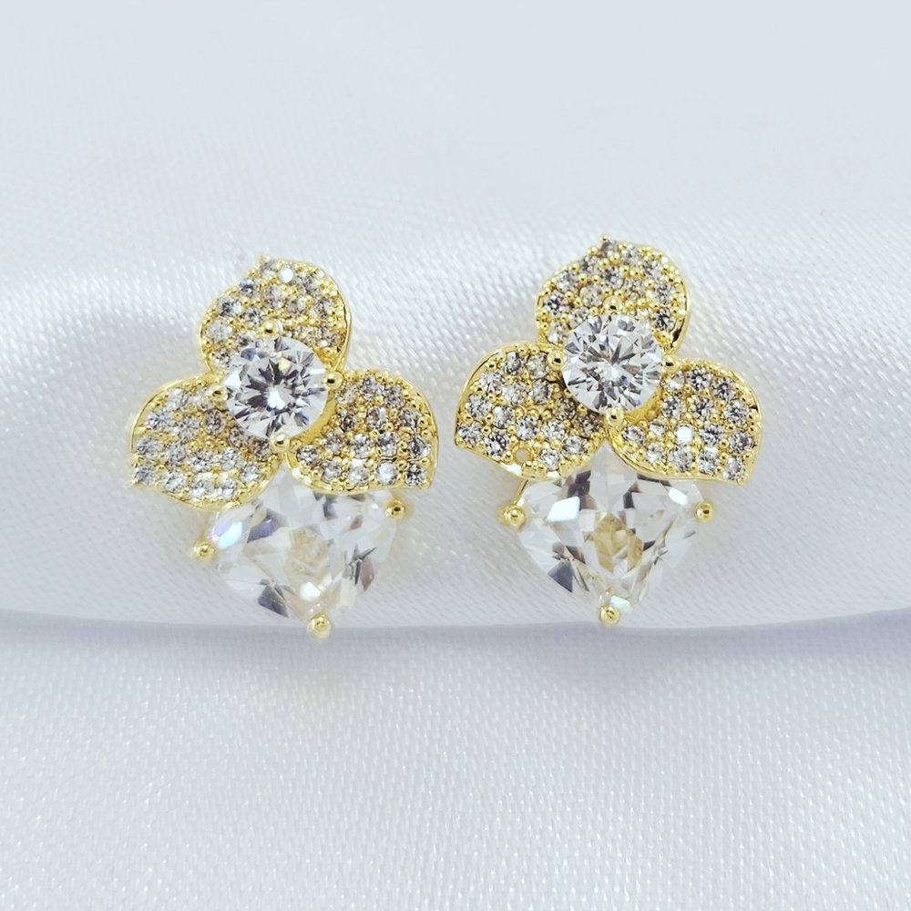 Brinco flor três petalas com cristal formato coração