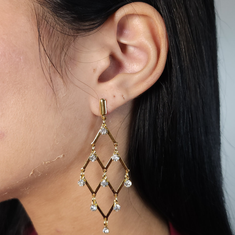 Brinco losangos lisos vazados com pêndulos pedras cristais