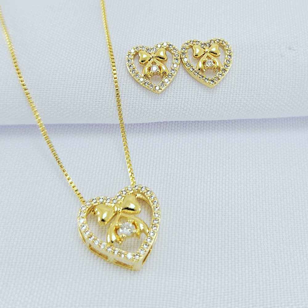 Conjunto coração com laço e pedra cristal cravejado