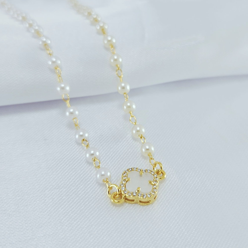 Gargantilha choker pérola com trevo borda cravejada