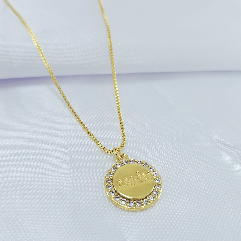 Gargantilha com pingente círculo nome AMÉM fios cravejado