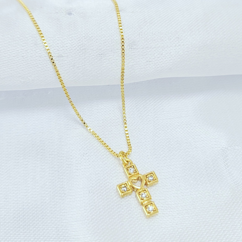Gargantilha cruz cristais detalhados coração vazado