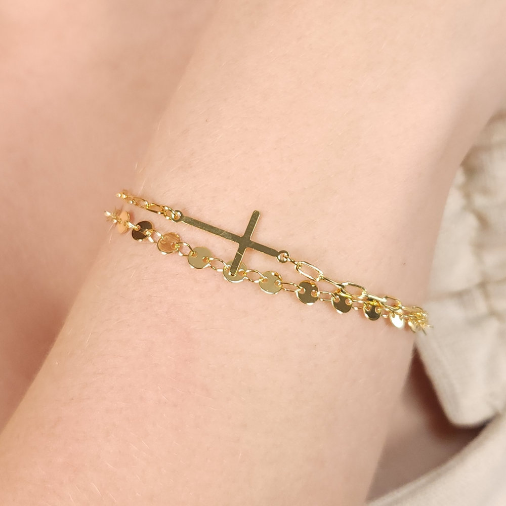 Pulseira dupla elos redondos chapeado e cartier com cruz