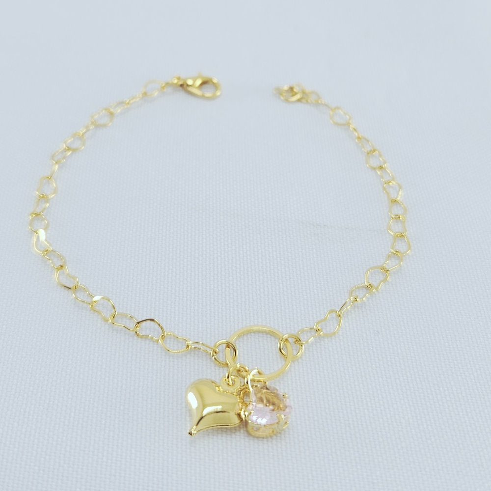 Pulseira elos vazado com pedra rosa e coração pêndulo