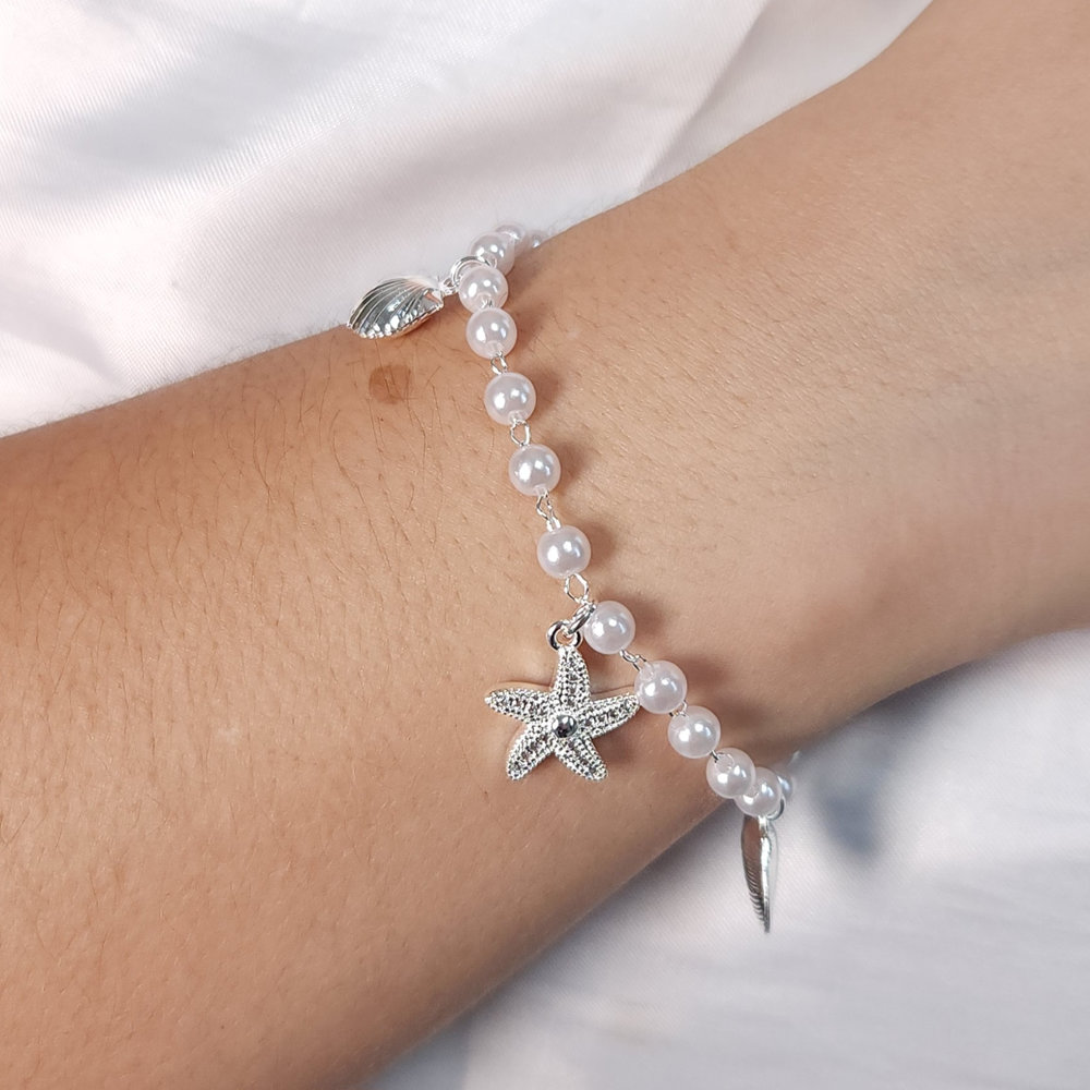 Pulseira pérolas com pêndulos concha e estrela-do-mar