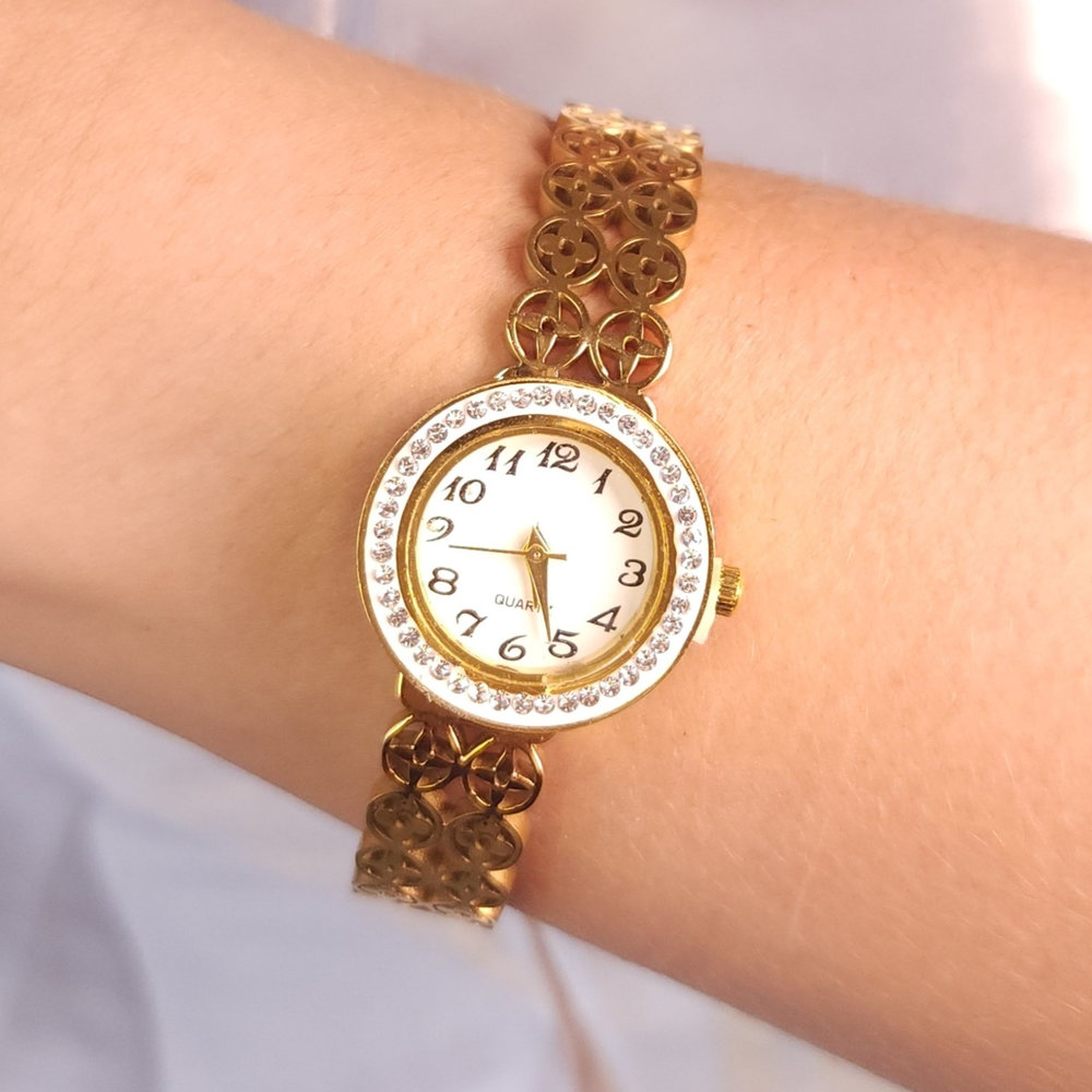 Relógio bracelete detalhe cravejado com trevo e estrela vazada