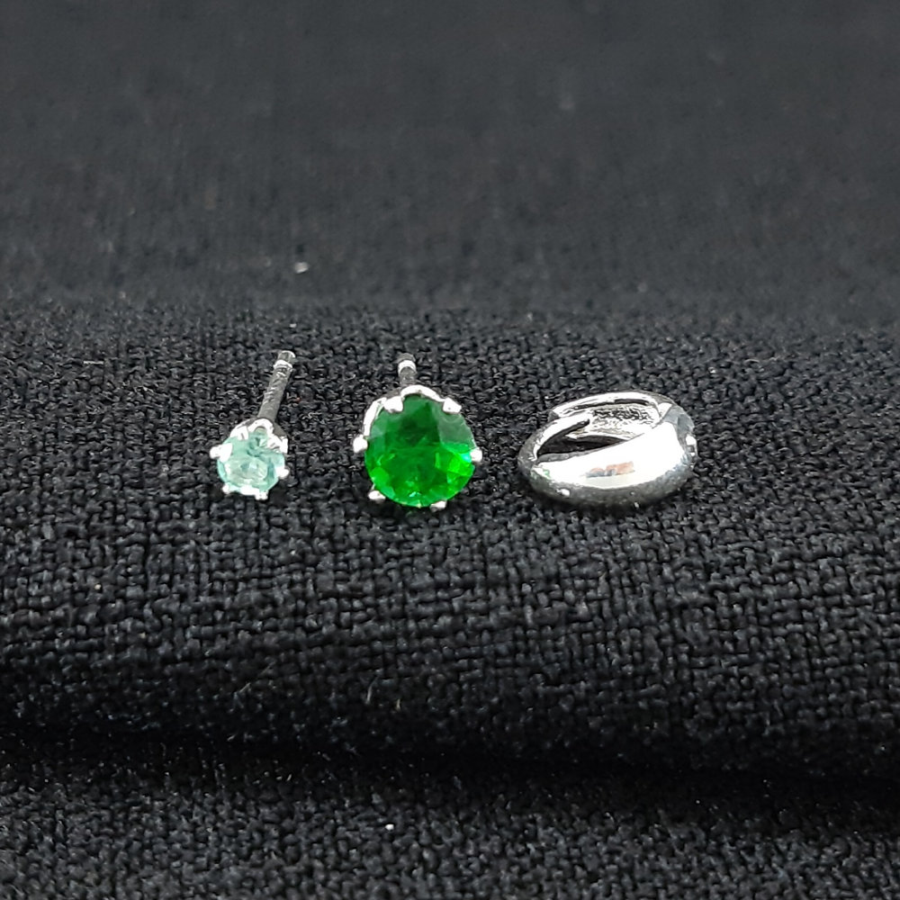Trio de brincos pontos de luz verde e azul com argolinha lisa